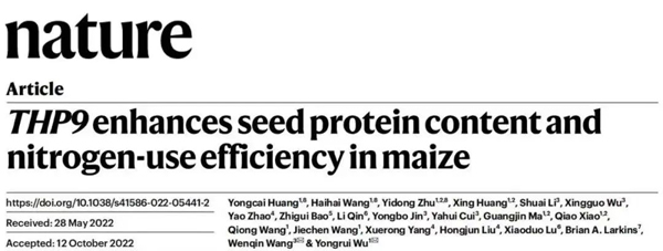 北京時間2022年11月17日,中國科學院分子植物科學卓越創(chuàng)新中心巫永睿研究團隊與上海師范大學王文琴研究團隊合作在Nature上發(fā)表了題為 “THP9 enhances seed protein content and nitrogen-use efficiency in maize”的研究論文。